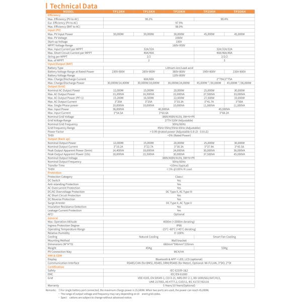 The TP12KH-TP30KH inverters are high-power, commercial and industrial-grade solar hybrid solutions. Their standout features are record-high efficiency (up to 98.4%), massive PV input (45kW) and battery charge power (45kW), robust IP66 protection, ultra-fast backup (<10ms), and extensive global certifications including NRS 097-2-1 and AS 4777.2. They are particularly well-suited for: